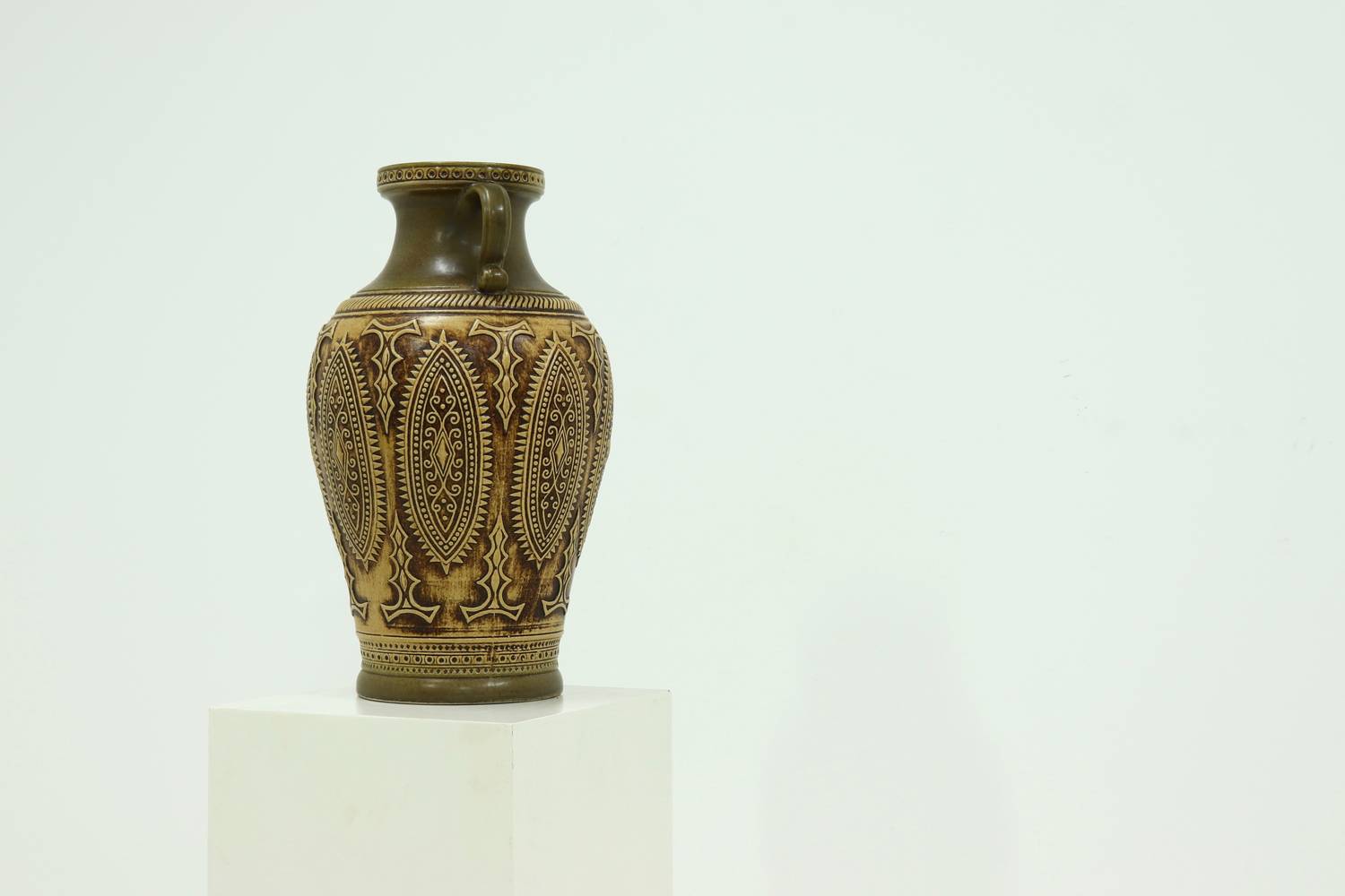 This striking XL vase by Jasba showcases the timeless craftsmanship of German mid-century ceramics. Its generous form is finished in rich earth tones, giving it a warm, organic presence. With a subtle neoclassical influence in its design, the piece combines sculptural elegance with a refined decorative appeal. Both functional and collectible, this vase stands as a statement object. Remains in excellent condition.