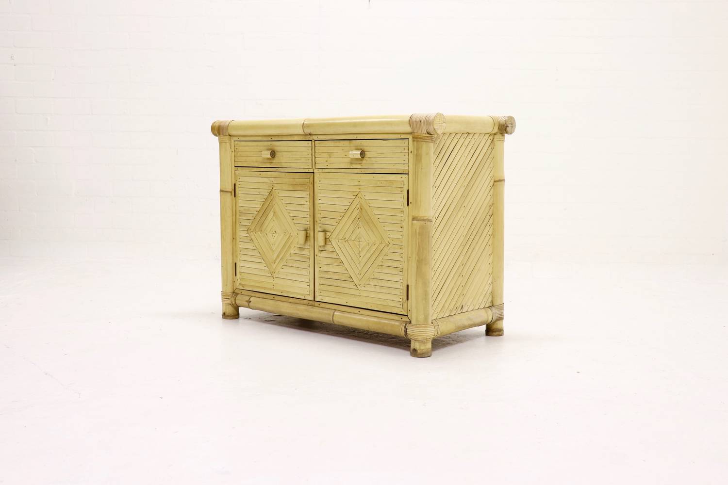 ContactNice sized rattan and bamboo sideboard from the 1970s. The sideboard features 2 drawers and 2 doors at the bottom. Nice piece which remains in good condition.
